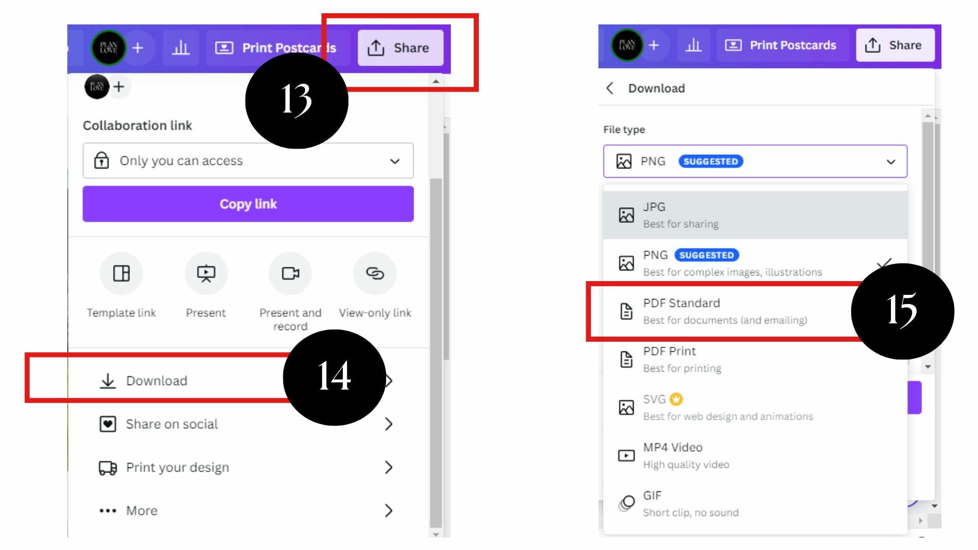 Once you’re happy with the direct mail postcard design and get it ready for printing or sending online, click the “Share” button and then “Download.” Also, give your file a name. Finally, save it to the designated folder on your device.