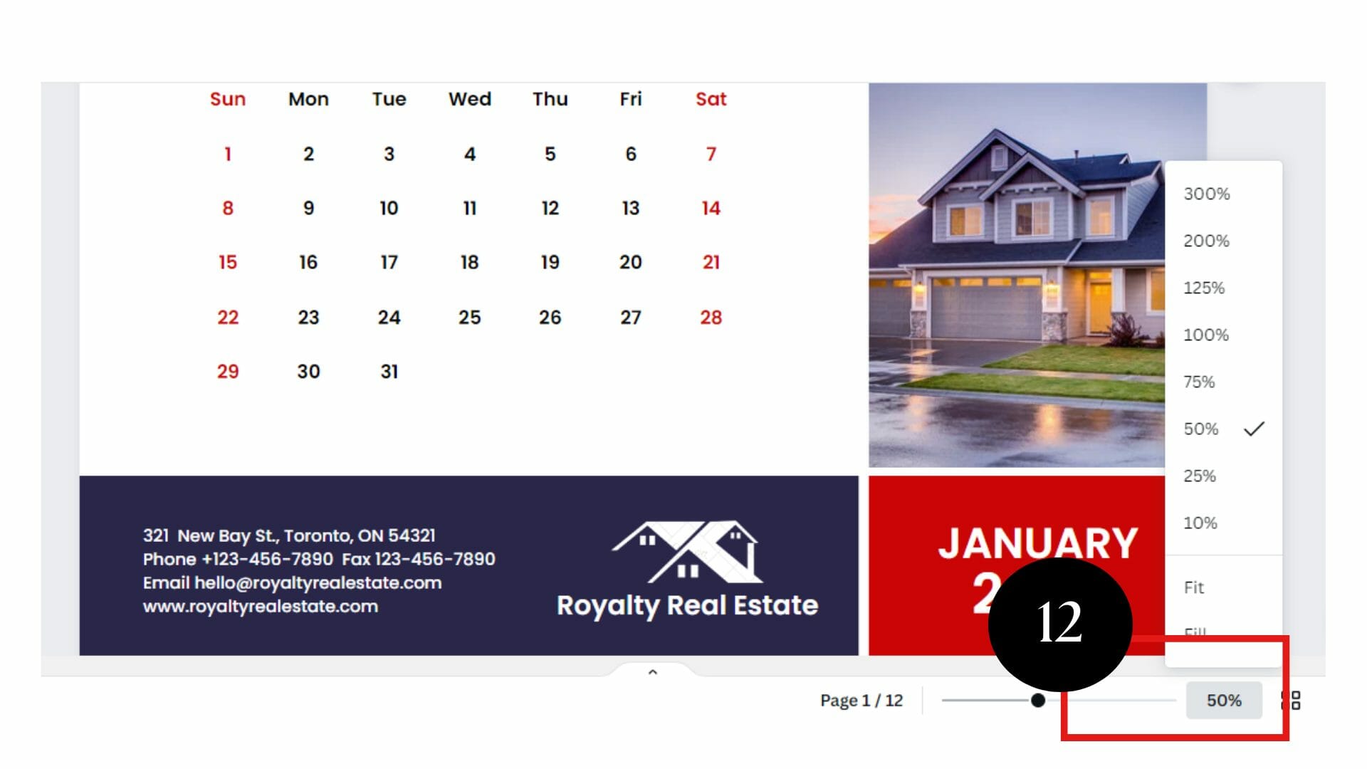 You can view your work and spot errors using the Zoom tool. This tool is located in your workspace’s bottom right-hand corner. Zooming out and viewing the calendar template, you can see its entirety.