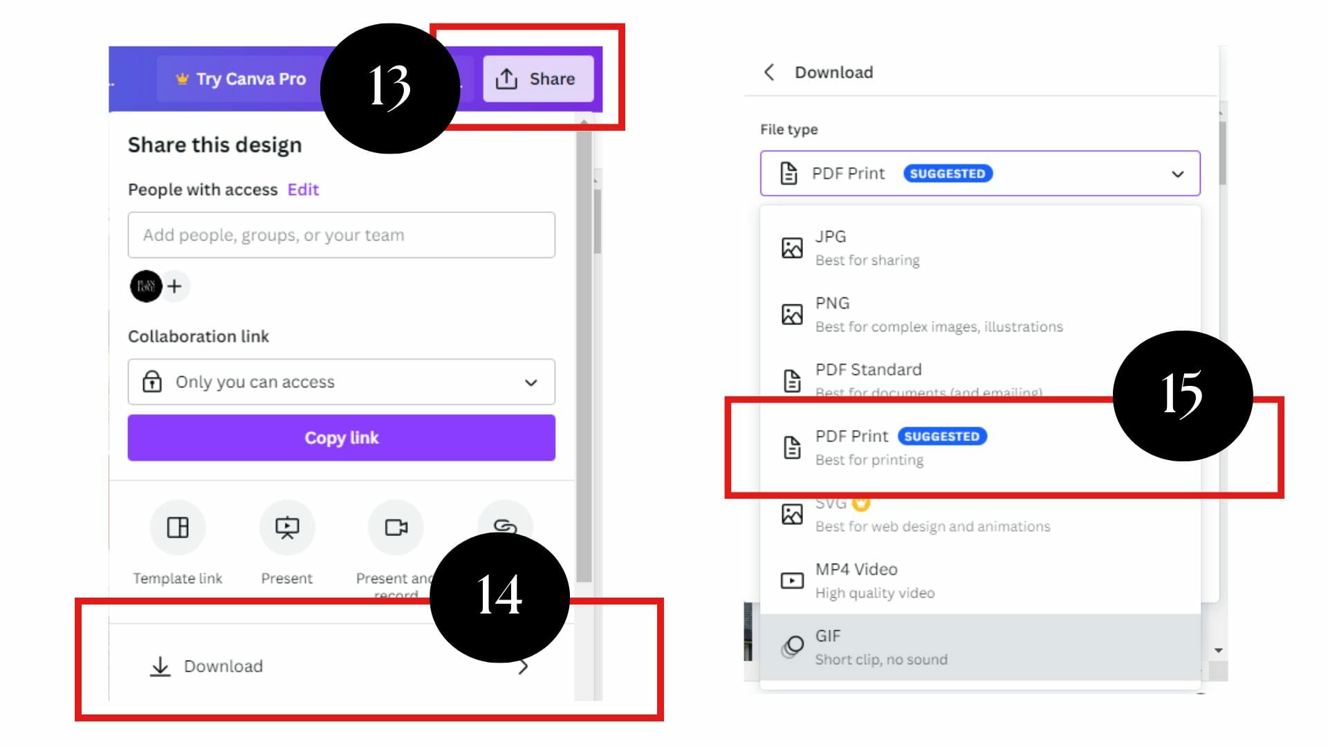 At last, your branded real estate calendar is complete. So, it’s time to download it. To print a copy, go to “Share” > “Download” at your workspace’s top right corner. Select the file format you like, PDF or PNG. Finally, give the file a name and save it in your device’s designated folder.