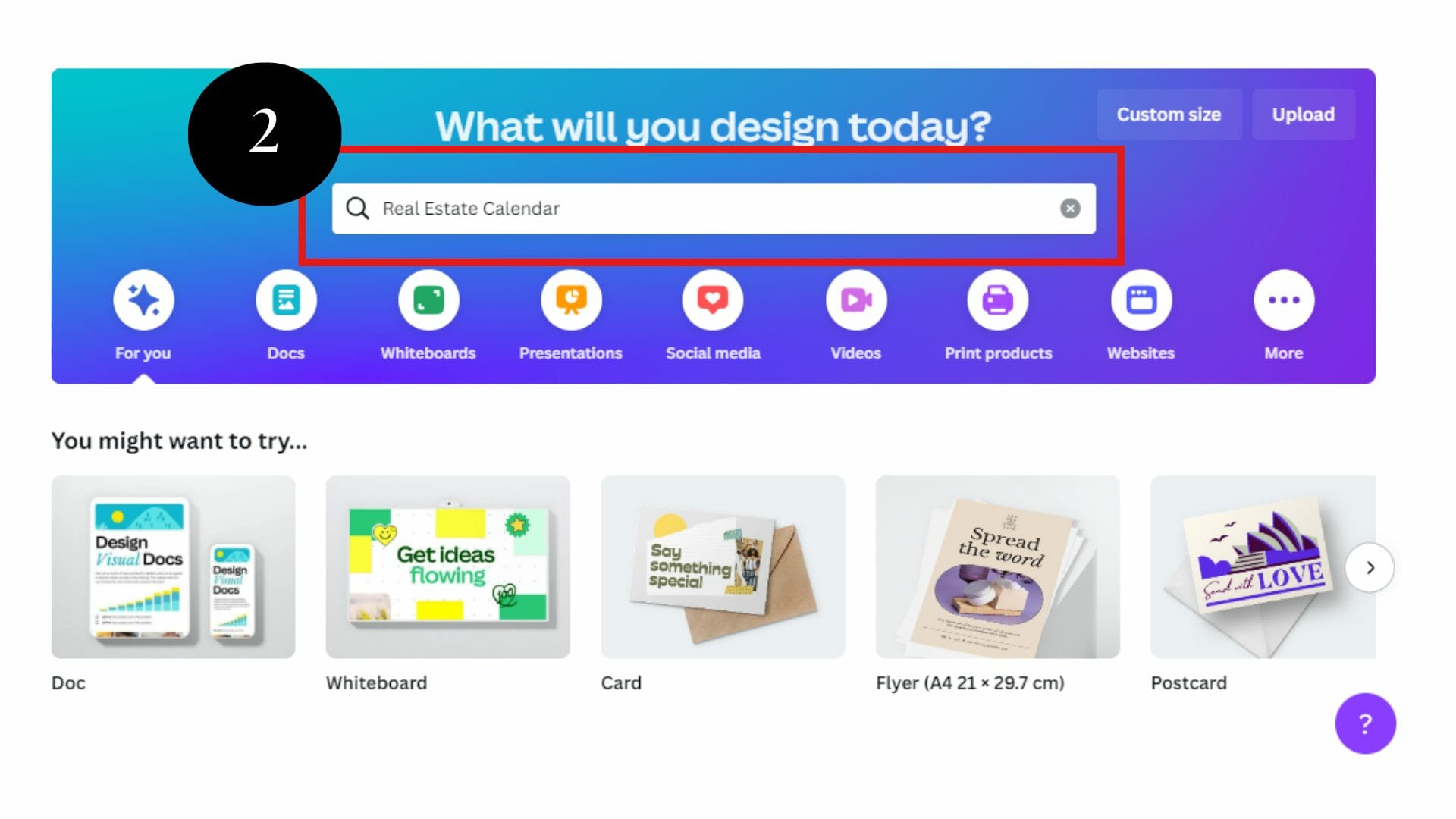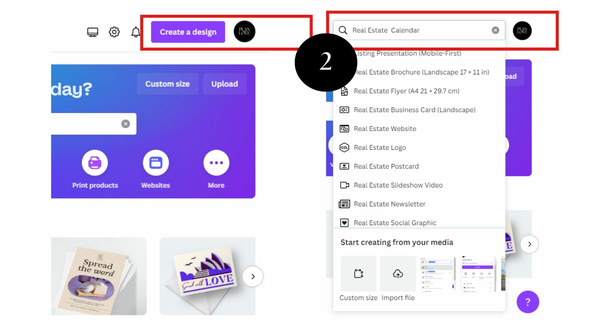 There are two ways to find real estate calendar templates: using the search bar and scrolling through templates listed under the “Create a design” header.