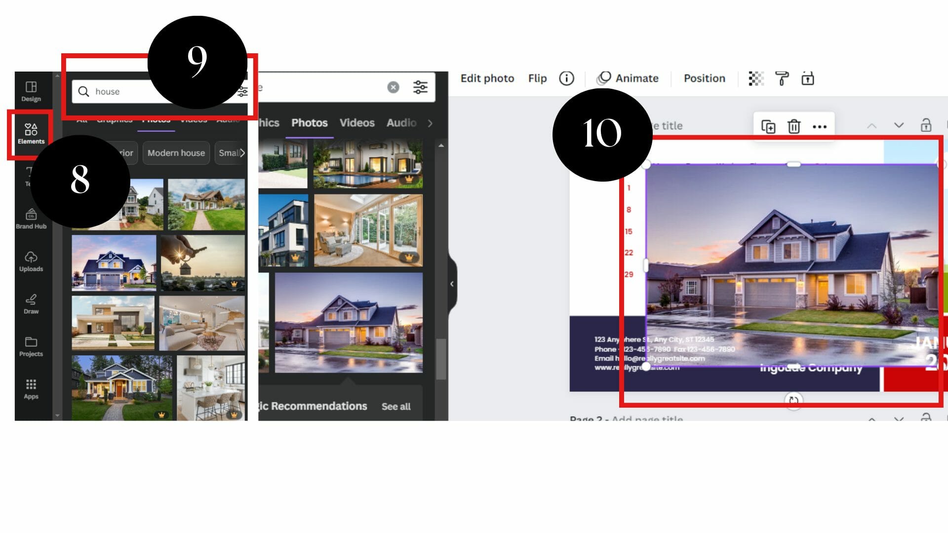 On the “Elements” tab, click “Search” and then type the image you like. Also, you can change the colors on some photos. Do it by clicking the image and checking the toolbar at the workspace’s top left corner.