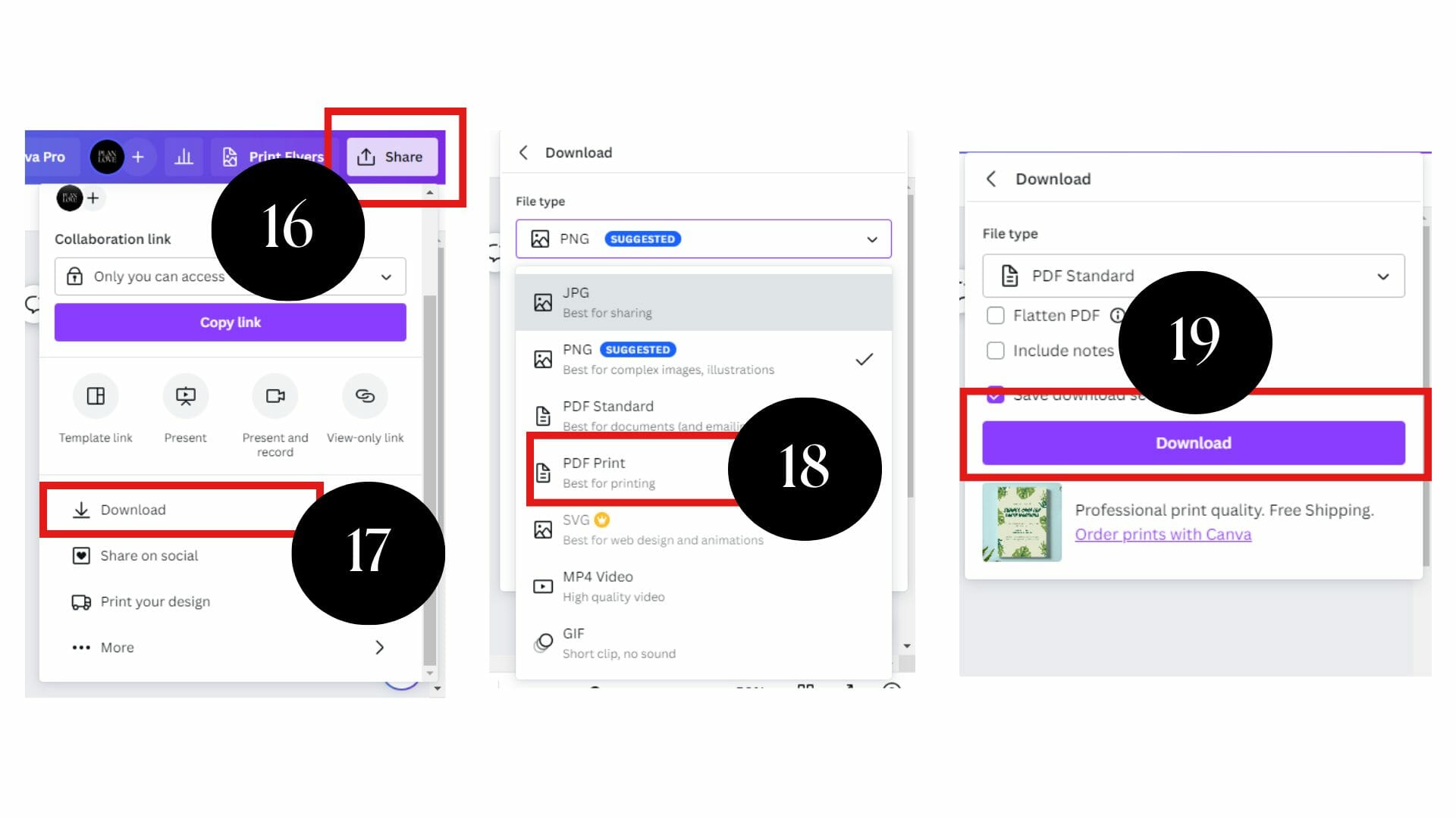 To download your real estate flyer, click “Share” > “Download” at your workspace’s top right corner. Choose your preferred file format, like PNG, JPEG, or PDF. Then, click the “Download” button and give the file a name. Your file will automatically save to your device.