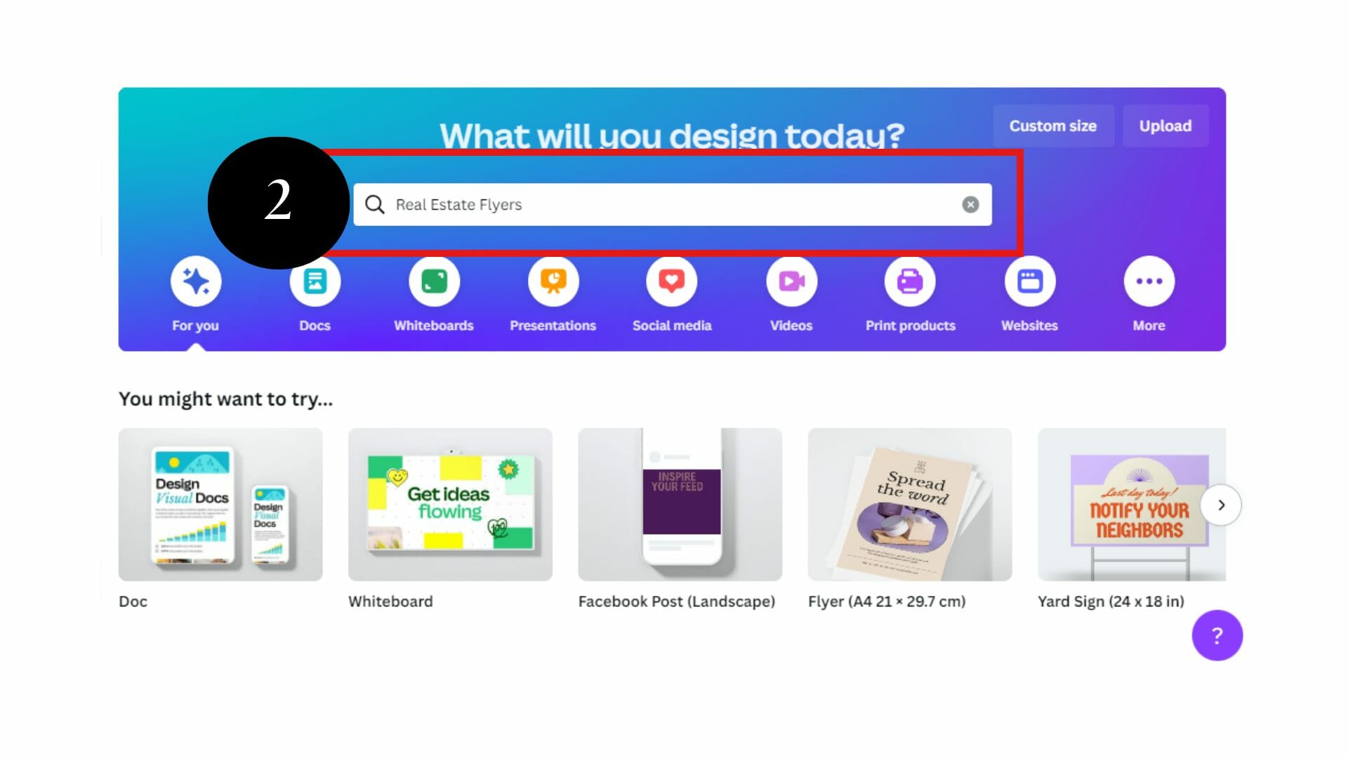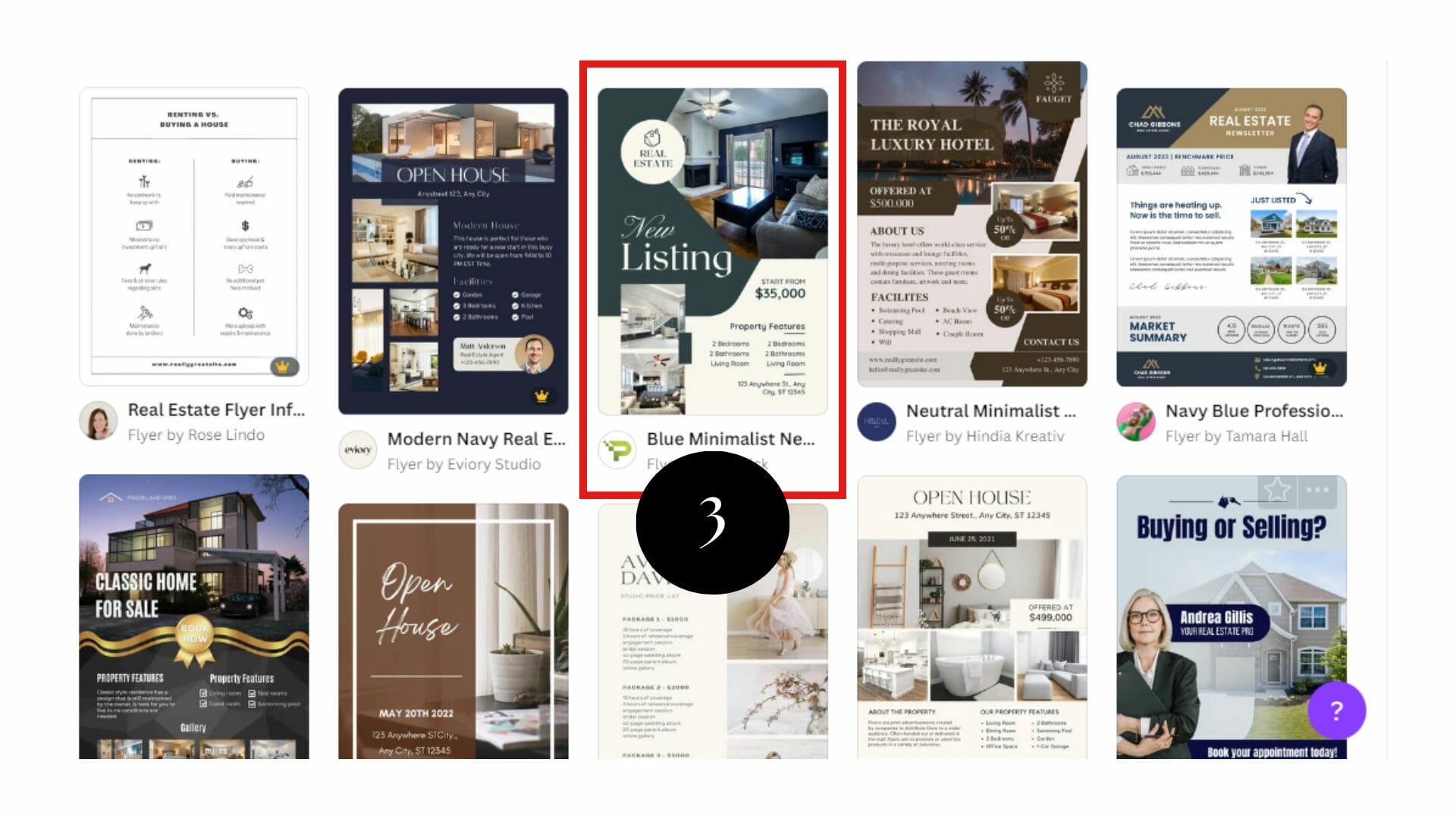 The easiest way to find a template is by using the search bar in the upper corner of Canva’s homepage. For example, you can type “Real Estate Flyers.” Alternatively, click the “Template” button and select “Marketing” > “Flyers.”