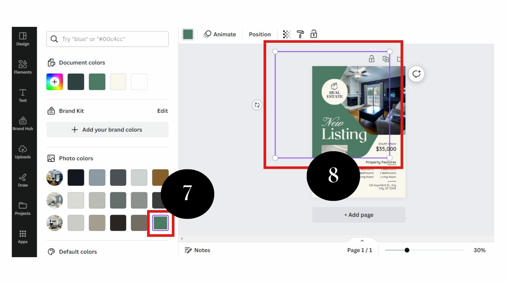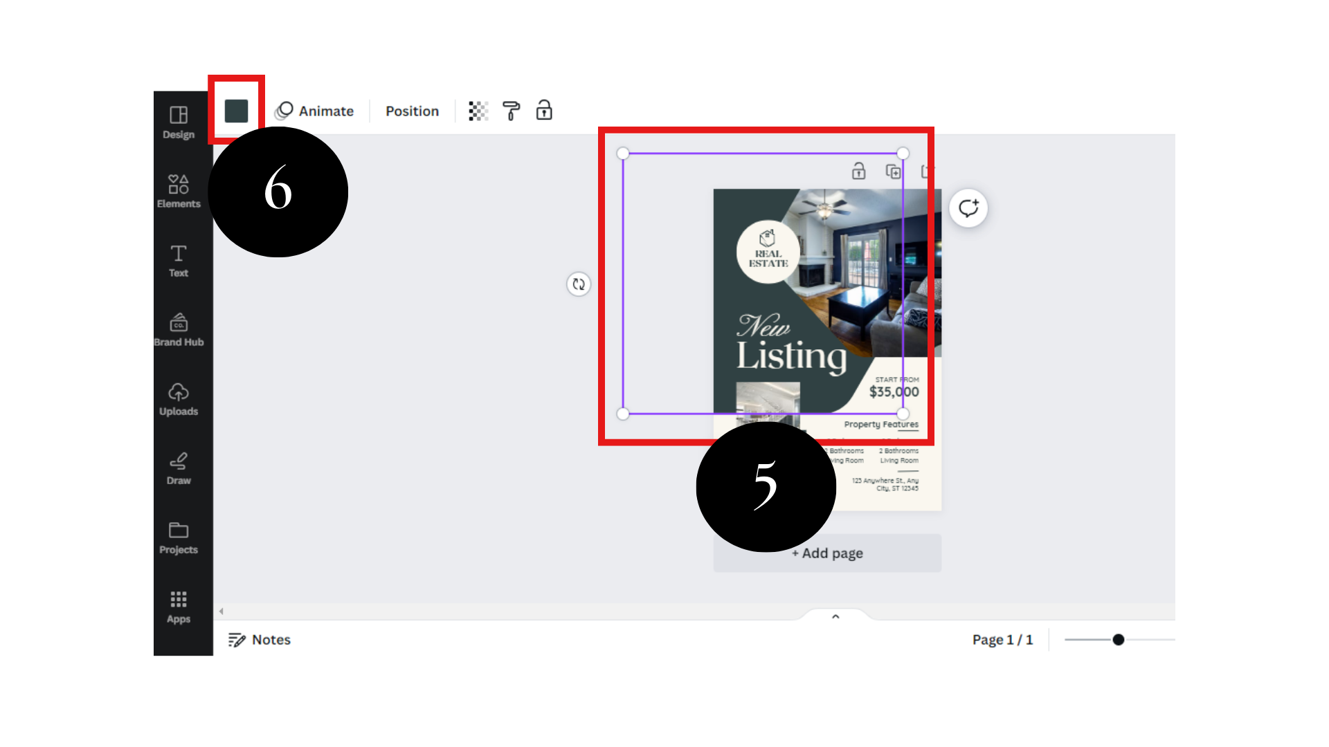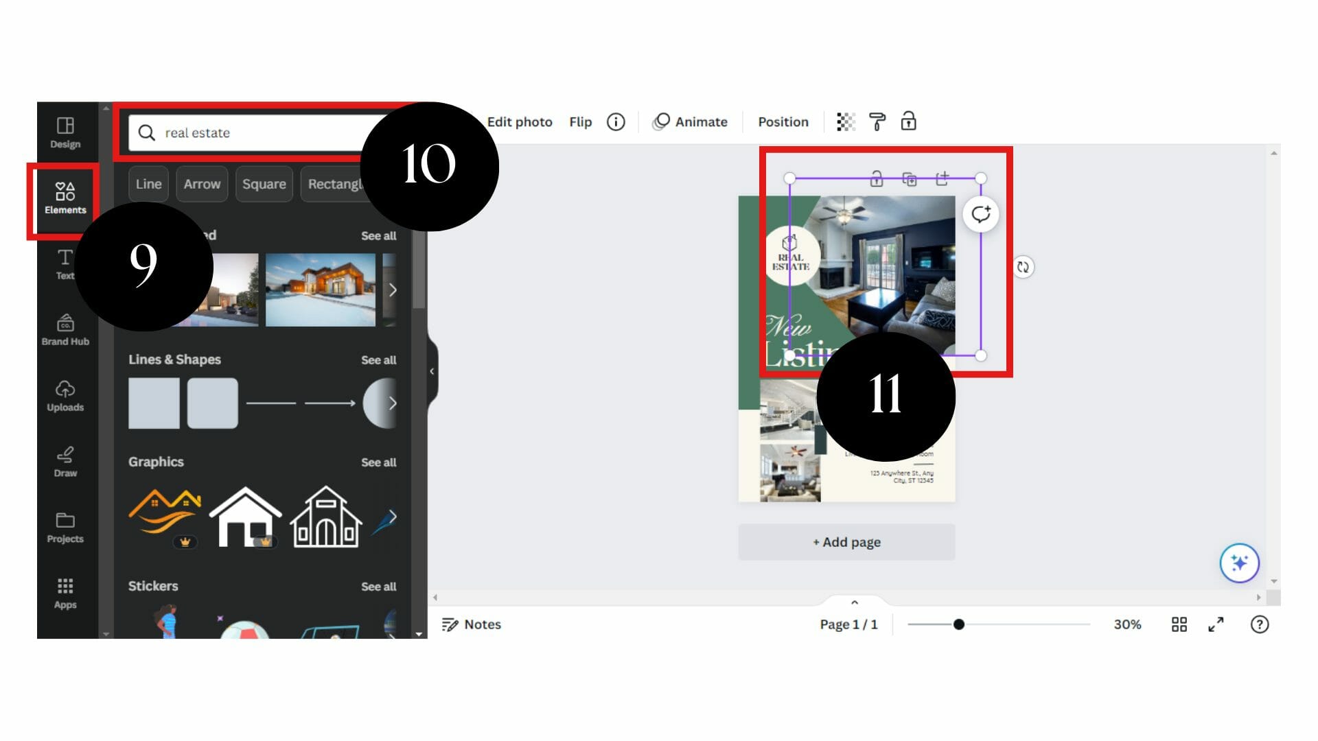 Canva allows you to add or change the images in the pre-designed templates to complement your unique advertising needs. Click the “Elements” tab, type your preferred image in the search bar, or use your own property shots.