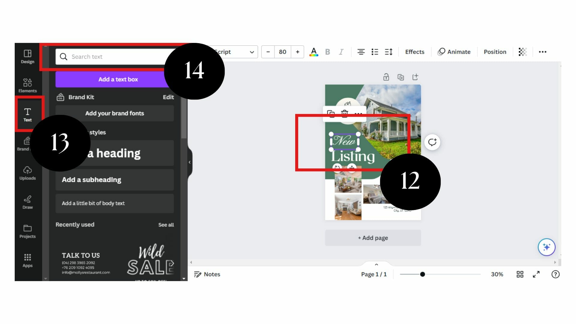 Pro tip: Keep your text concise and incorporate important information like the property’s type, like ”Open House,” “New Listing,” “For Sale” or “For Rent.” You can add your contact details and a call-to-action, such as “Talk to Us,” “Call Now” or “Visit Our Website.”