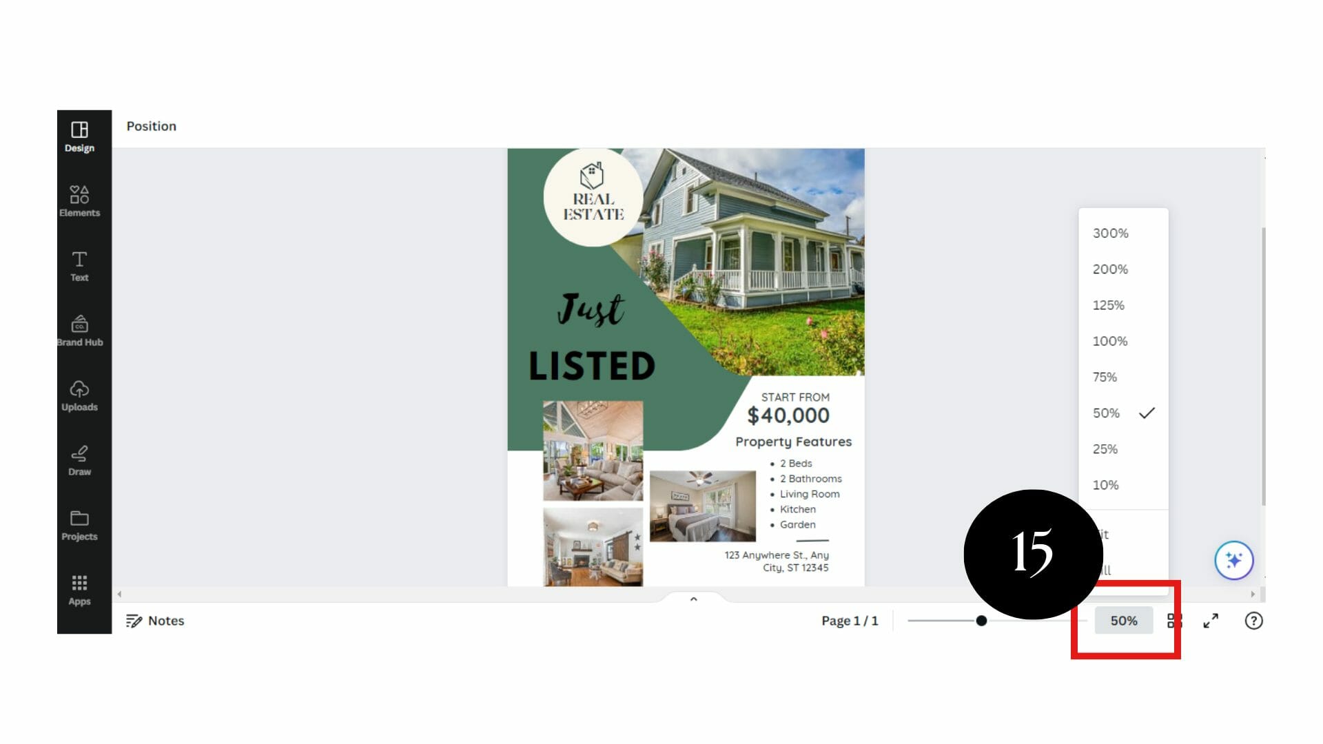 Your real estate ad template is almost complete. But before downloading the design, proofread it to ensure everything is clear and correct. You can use the zoom tool at the bottom right-hand corner to see the template design’s entirety.